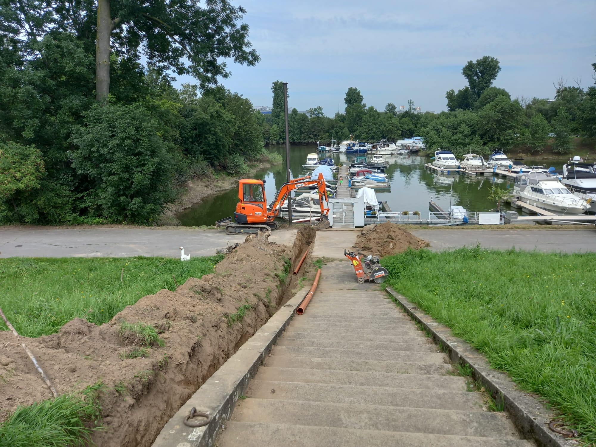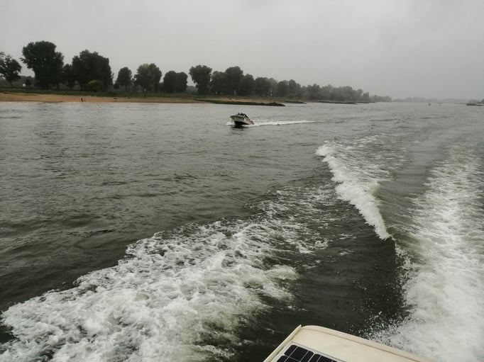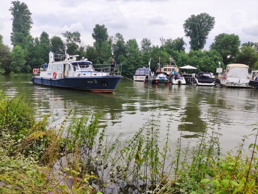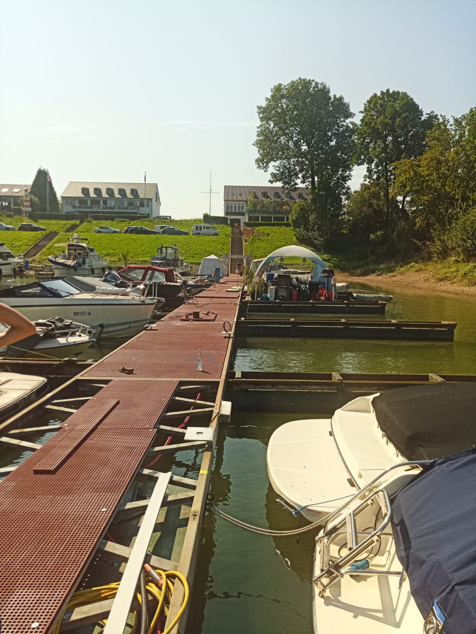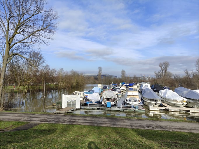 Zunächst machte das Hochwasser den Schiffseignern ein wenig zu schaffen. Beim Pegel von über 8m musste der Steg zusätzlich umfangreich gesichert werden. Wenige Zentimeter fehlten noch bis die Versorgungsstraße geflutet worden wäre, weite Teile des Campingplatzes standen bereits unter Wasser. Unsere Freunde vom Motor-Yacht-Club Düsseldorf waren bereits vom Festland abgeschnitten, konnten ihren Steg nur per Boots-Shuttle-Service erreichen.