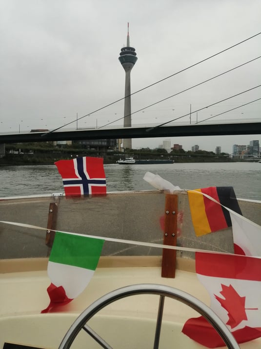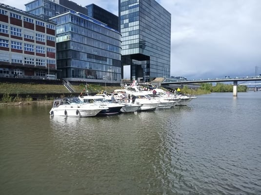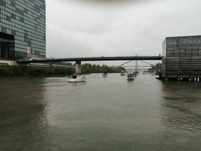 Wir fuhren gemeinsam mit etwa 30 Booten rheinaufwärts bis zum Medienhafen.