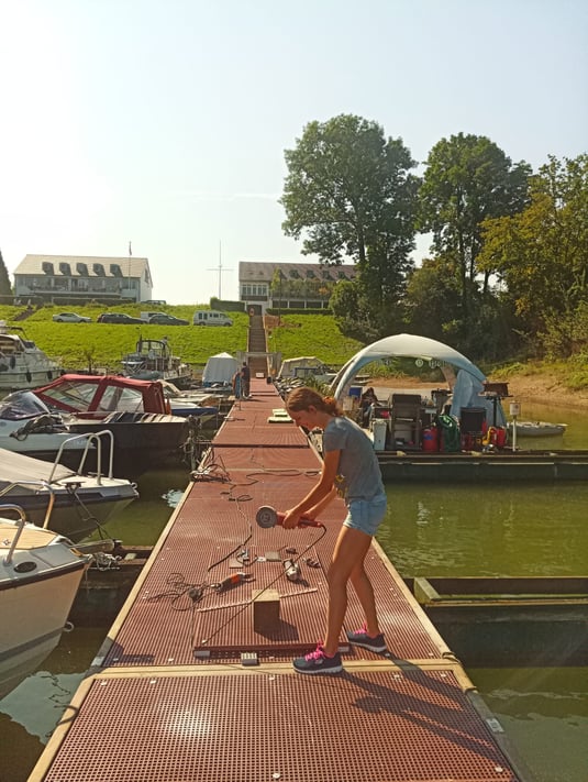 Die Reparatur der Stegverankerung jedoch musste ausgiebig geplant werden. Und so vergingen ein paar Wochen, bis wir gemeinsam mit der tatkräftigen Hilfe der DLRG und der WSP den Anker lokalisieren, verrücken und wieder mit dem Steg verbinden konnten.